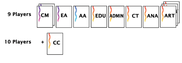 9 players: Committee Member (x2), Executive Assistant, Anonymous Artist, Art Educator, Administrator, Copyright Thief, Anarchist, Artist (x3). Add Community Consultant for 10 players.